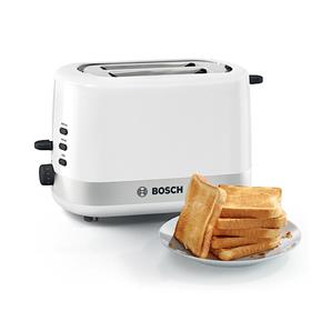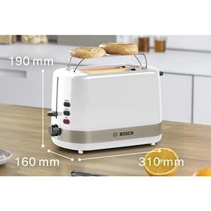 با خرید توستر نان بوش مدل TAT6A511 در زمان سرو صبحانه یا میان وعده ها، همواره نان گرم در کنار شما خواهد بود. کارایی توستر نان تنها برای برشته کردن نان تست نیست و می توان انواع نان نظیر نان بربری، سنگک، شیرینی ها، کیک ها و کروسان ها را برشته و گرم کرد. این توستر با توان 800 وات از قدرت و سرعت خوبی در داغ و برشته کردن نان ها برخوردار بوده و از عملکردهای آن می توان به تست و برشته کردن، یخ زدایی و گرم کردن مجدد نان اشاره کرد. شما به نان تست کاملا برشته شده و قهوه ای علاقه دارید یا نان طلایی؟ این توستر همه ذائقه و سلیقه ها را پوشش داده و با قابلیت تنظیم حرارت در 7 درجه متنوع این امکان را فراهم کرده تا نان های کاملا برشته و قهوه ای و یا نان کمتر برشته شده را دریافت کنید. تنظیم میزان برشته شدن توسط دکمه چرخشی روی بدنه فراهم شده است. به لطف المنت گرمایشی با سطح بزرگ و سیستم برشته کن متمرکز قرار گرفتن خودکار نان در مرکز الگوی برشته کردن یکنواخت نان اجرا شده و شما هیچگاه نان سوخته یا سرد و بی مزه نخواهید خورد. در صورت گیر کردن نان، سیستم خاموش شدن خودکار به کمک می آید و جهت حفظ ایمنی و پیشگیری از خطرات دستگاه را خاموش می کند. قابلیت بلند کردن سریع اجازه می حتی برشهای کوچک نان را به راحتی جدا کنید.