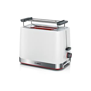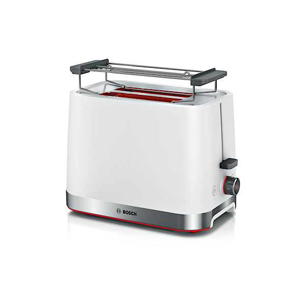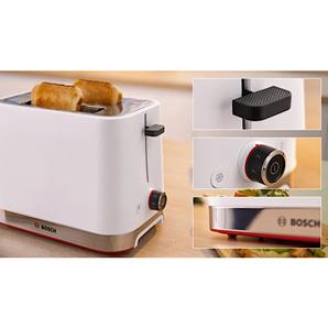 در زمان سرو صبحانه و یا میان وعده همواره نان گرم و برشته در کنار شما می باشد. توستر بوش مدل TAT4M221 با توان 950 وات و عملکرد آسان نان های یخ زده ای را که از فریزر خارج کرده اید، به سرعت گرم و برشته می کند، گویی همین الان نان ها را خریده اید. این توستر در کنار گرم و برشته کردن نان، قابلیت گرم کردن شیرینی جات، کیک و کروسان ها را نیز دارد. به لطف قابلیت تنظیم حرارت در 7 درجه مختلف می توانید نان خود را به هر میزان که دوست دارید، برشته و قهوه ای کنید. این کار توسط دکمه چرخشی روی بدنه امکانپذیر است. یکی از ویژگی های خوب این محصول تجهیز به سیستم برشته کن متمرکز است که سبب شده تا همه سطح نان به طور یکنواخت، داغ و برشته گردد. این سیستم با کنترل درجه حرارت از داشتن نان با تست غیر یکنواخت و یا سوخته پیشگیری می کند. همچنین این محصول دارای قابلیت خاموش شدن خودکار جهت افزایش ایمنی و جلوگیری از سوختن نان می باشد. توستر نان بوش مدل TAT4M221 از طراحی شکیل و زیبا به رنگ مشکی بهره می برد. این دستگاه جمع و جور و سبک روی میز یا کابینت فضای کمی را اشغال می کند. پس هر روز قبل از سرو صبحانه ابتدا نان ها را داغ و برشته کرده تا لذت بیشتری از خوردن صبحانه ببرید. بدنه باکیفیت دستگاه از جنس پلاستیک بادوام و محکم ساخته شده و کاملا عایق می باشد تا دست تان حین کار نسوزد. بر روی بدنه توستر BOSCH TAT4M221 چند دکمه به چشم می خورد و شامل دکمه چرخشی تنظیم میزان برشته شدن نان، دکمه یخ زدایی و توقف عملیات می باشد که علاوه بر زیبایی، کاربری دستگاه را نیز راحت تر کرده است. بالای بدنه دو عدد شکاف به چشم می خورد که می توان درون آن دو نان تست، دو عدد شیرینی و یا تکه های نان بربری و سنگک را قرار دهید. توسط دکمه کشویی روی بدنه می توان در انتهای عملیات گرم شدن، نان ها را برای برداشتن به سمت بالا بکشید. در قسمت پایین سینی کشویی جهت جمع آوری خرده نان ها طراحی شده است که از کثیف شدن میز و کابینت جلوگیری می کند. این سینی به راحتی باز شده و شستشو و نظافت آن آسان است. طول سیم برق این توستر نان 100 سانتی متر بوده و در زیر بدنه دستگاه یک محفظه جهت نگهداری و ذخیره سیم در نظر گرفته شده که علاوه بر محافظت از سیم به تمیزی و مرتب بودن فضای اطراف کمک می کند.